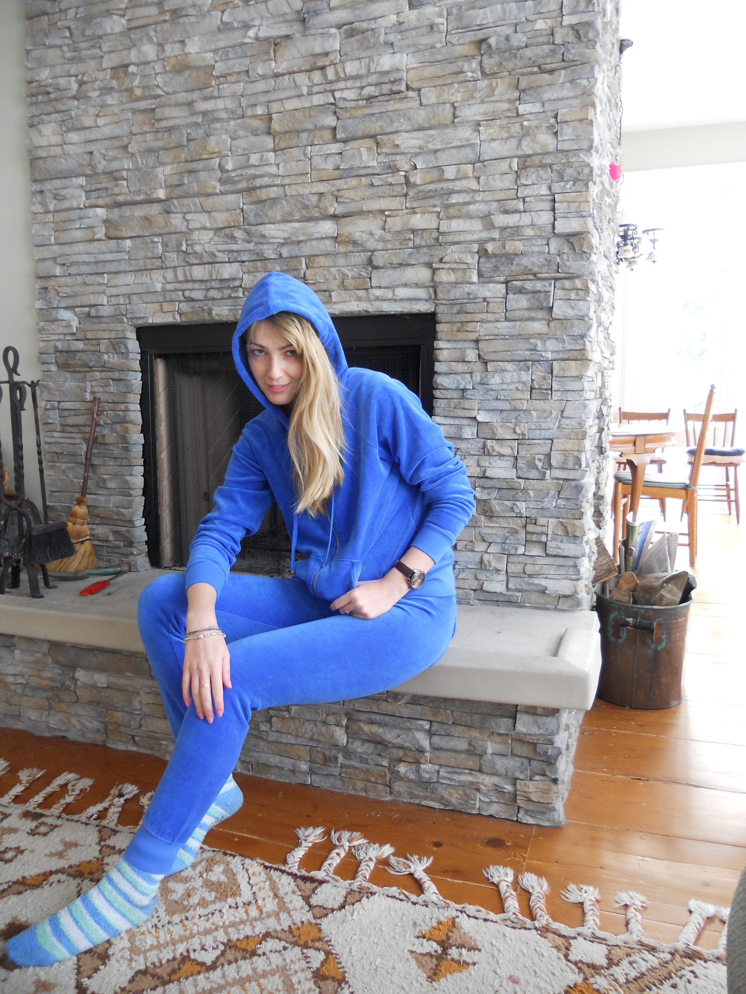 Warming up by the fire in my favorite electric blue Juicy Couture tracksuit (I love Juicy tracksuits and never miss the occasion to buy one, while in Canada) 😉