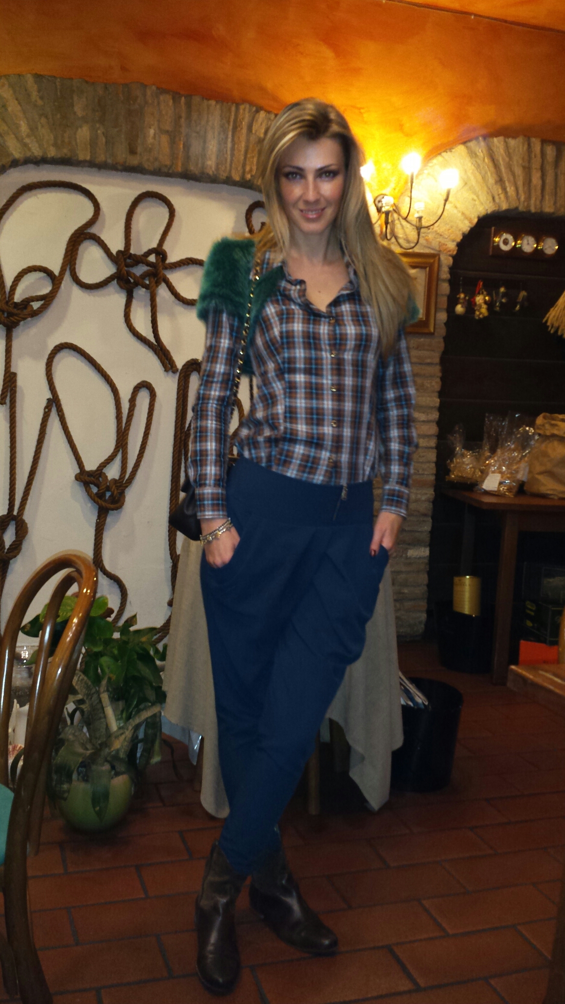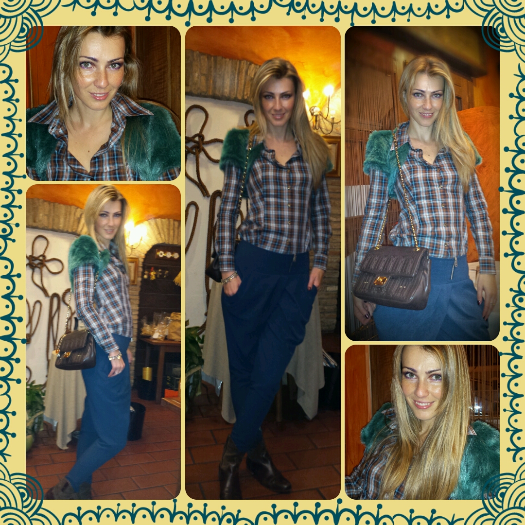 In fact, neutral brown chain Moschino Love purse tied together the brown boots and plaid shirt by color and Rinascimento dress pants by style!