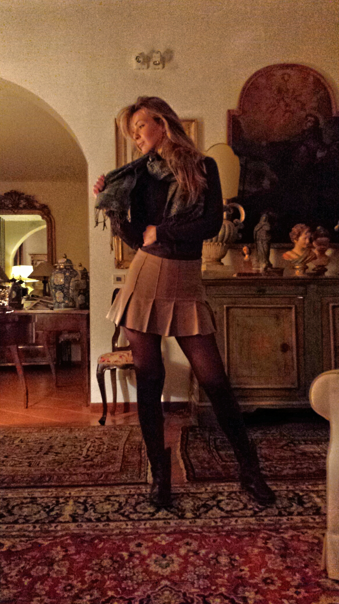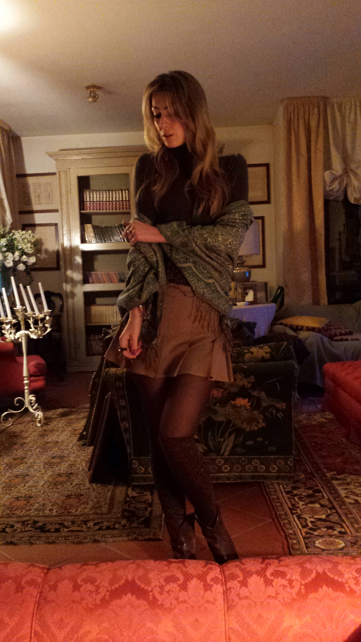 I didn’t wear heels, but opted for flat boots, a simple turtleneck (love turtlenecks in winter and so glad they are back in fashion this season), an extra big scarf to keep warm!