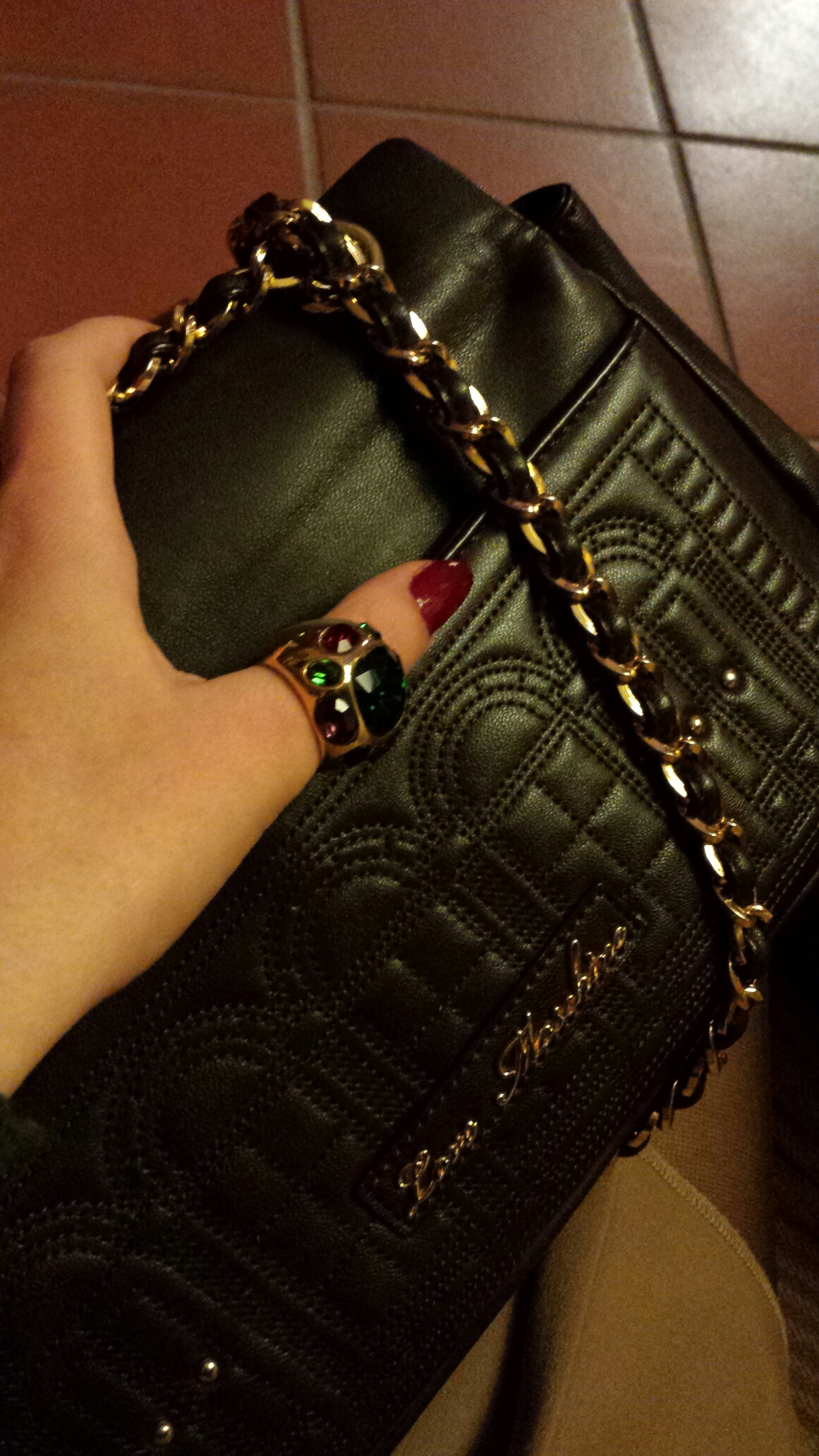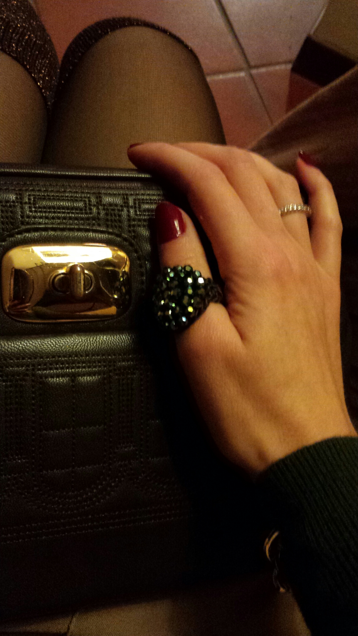 I accessorized with big rings and added a chain purse with a sweater coat! 😗