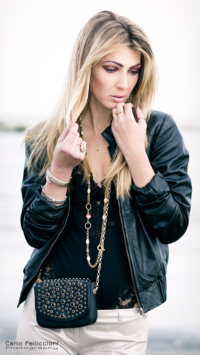 I love, love black leather this season and adding cascades of gold sparks makes me feel like a rock star (a black lace body reminds of Courtney Love rock trash, minus the smudgy makeup)!