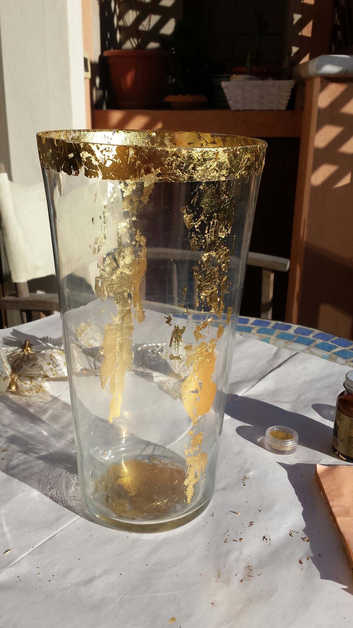 Next you need to prepare a large clear vase! I decided to gold-leaf mine on the edges (to match the butterflies). However, gold-leafing is not an easy procedure, so if you have never done it, use glass paint with dry brush or leave your vase simply as it is! π