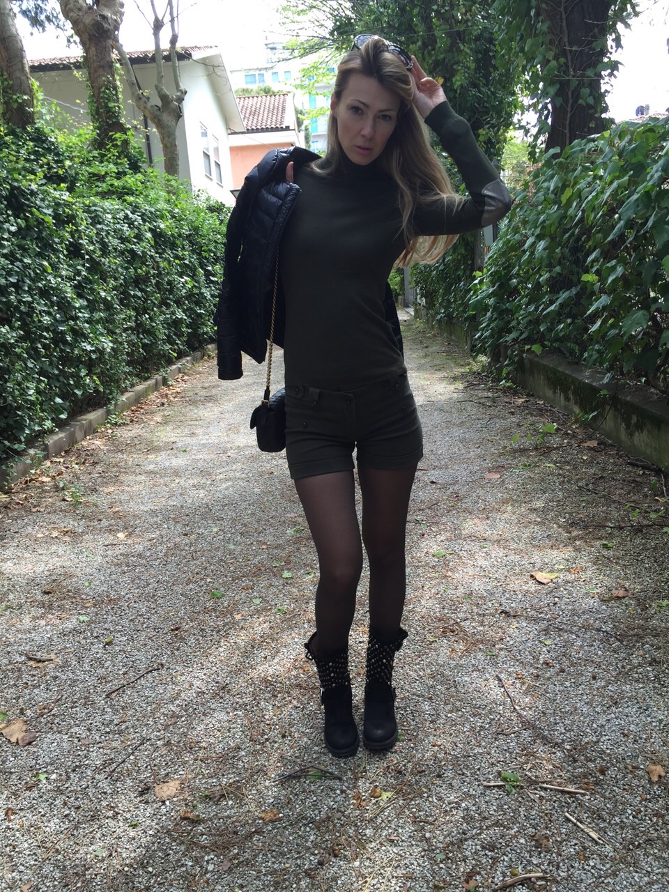 This morning I came out looking like Lara Croft, It was actually accidental! π I decided to wear a turtleneck, because I am sick (got a cold and a sore throat), then added a pair of tights and military shorts in same colour! Keeping It all simple and monocrome! ππ£π€