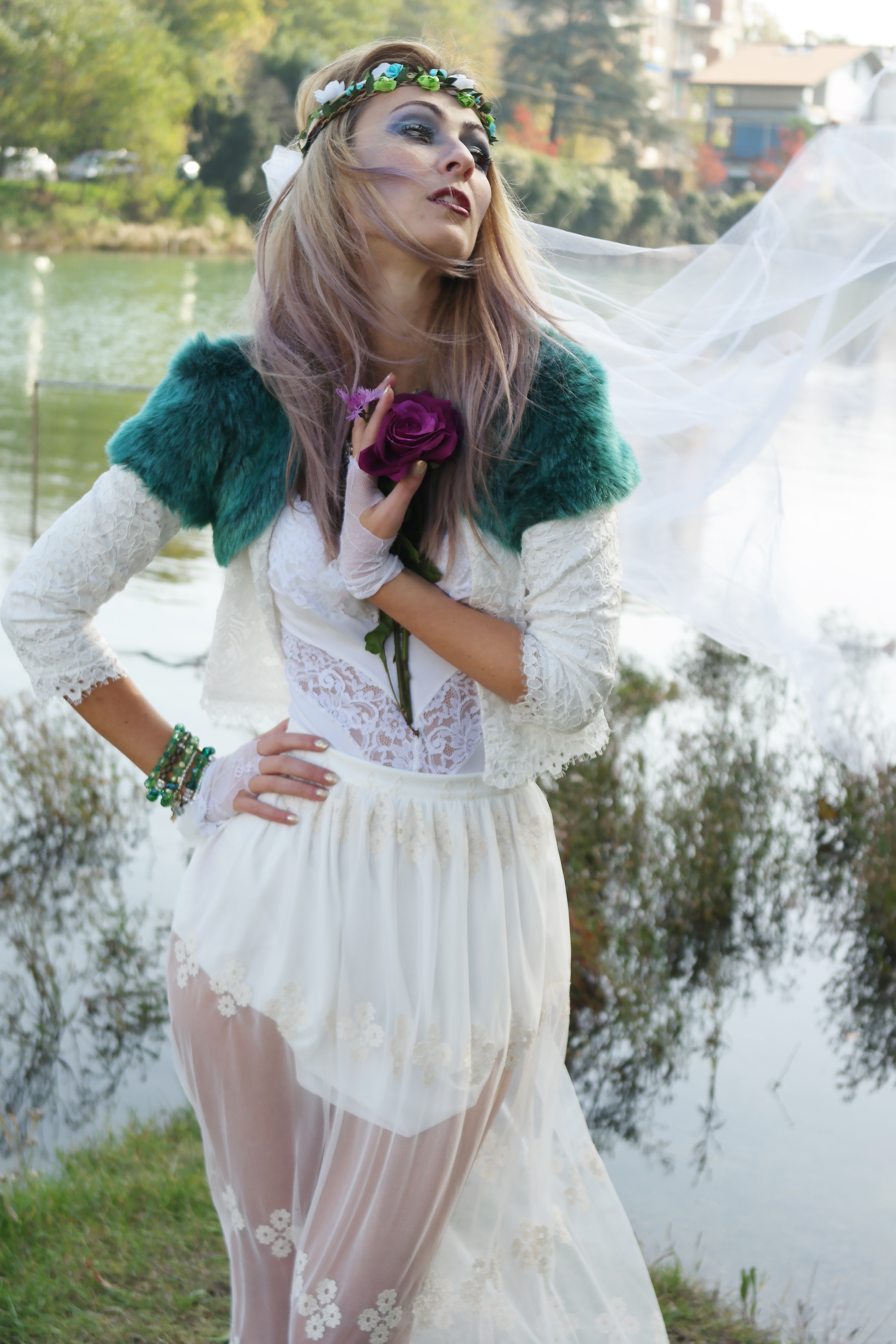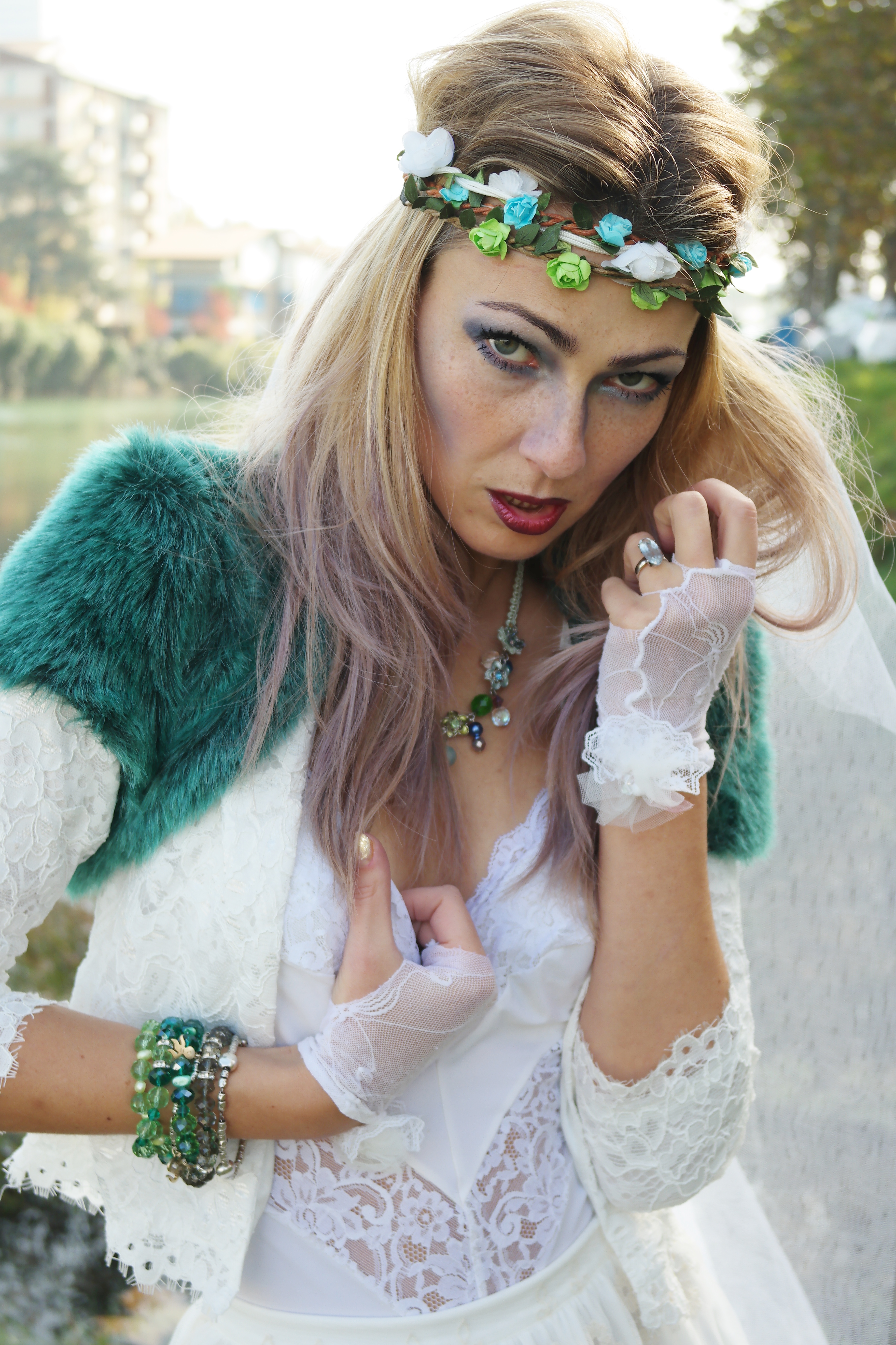 The look was all about white lace and sheer fabrics ❤ highlighted in petroleum green accessories! Those who follow me, know my love for colorful accents, so this shoot I styled with the hint of color on jewels, silk-flower crowns, shoes and faux-fur bolero (one of my favorite wardrobe staples)!