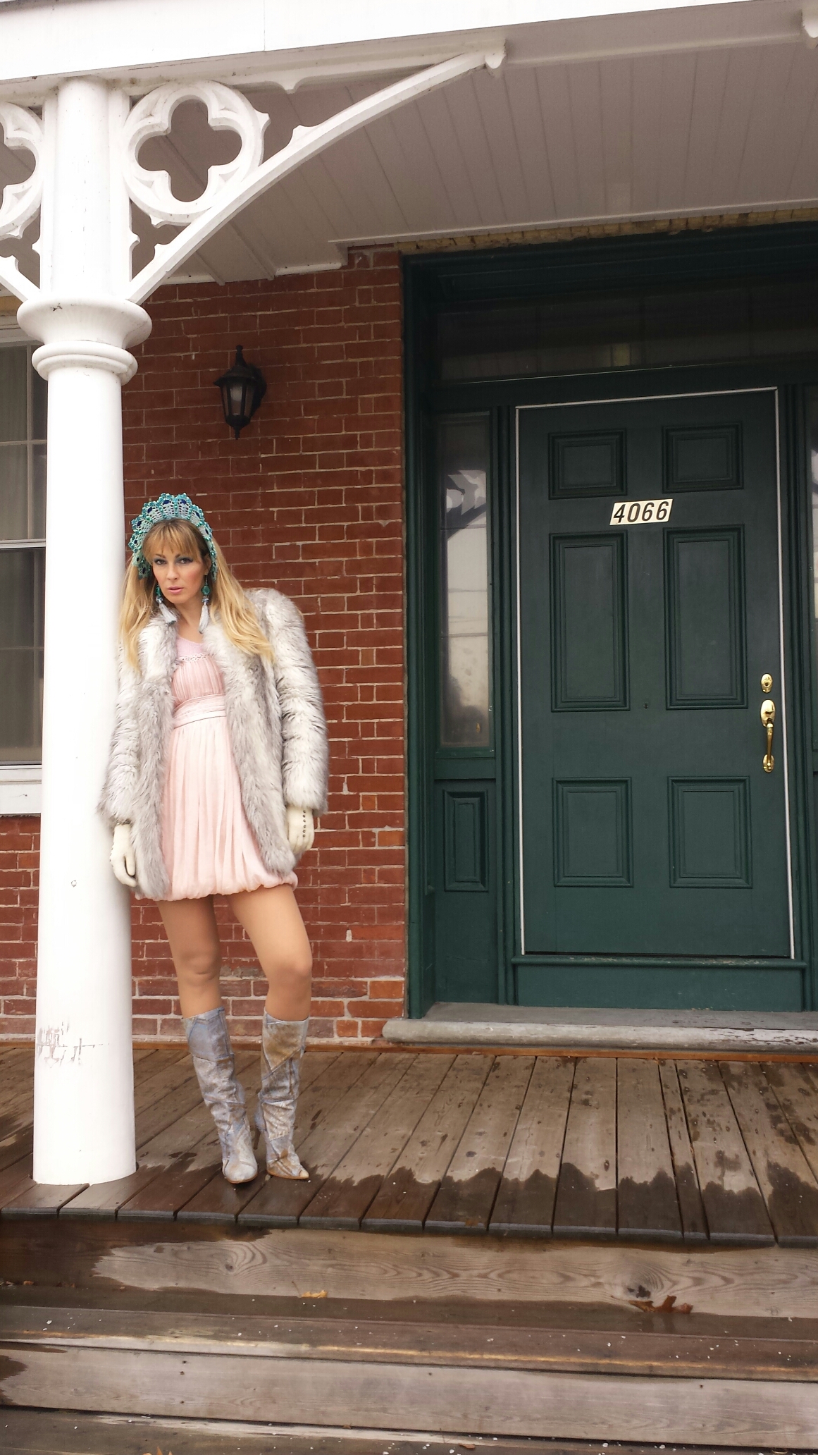 So, I figured I will shoot what it is! I found a pair of cowgirl inspired jean boots (yes, pointy is coming back and country cowgirl footweat were never as fashionable as today) and a little pale pink glitzy dress! 💟 If I was going to wait for snow on the the porch, then I was going to do it with ethnic glamor feel! 💎