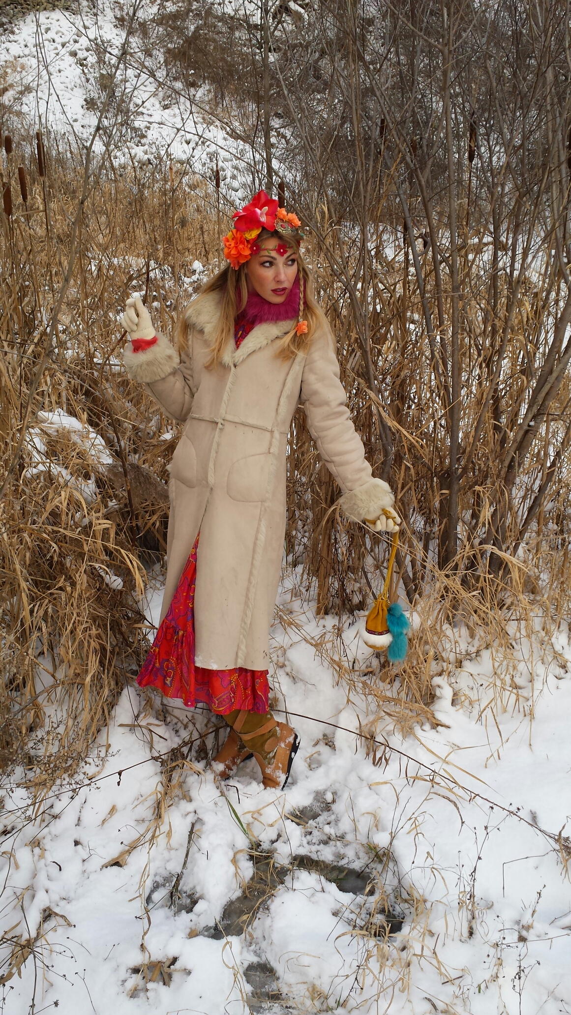 Iddie Fourka made this beautiful Russian-Ukrainian crown inspired headpiece πππ and we wanted to style something bright, fashionable with etnic-folk feel, that would contrast with the snow, but would also be wearable and definately not a costume!!