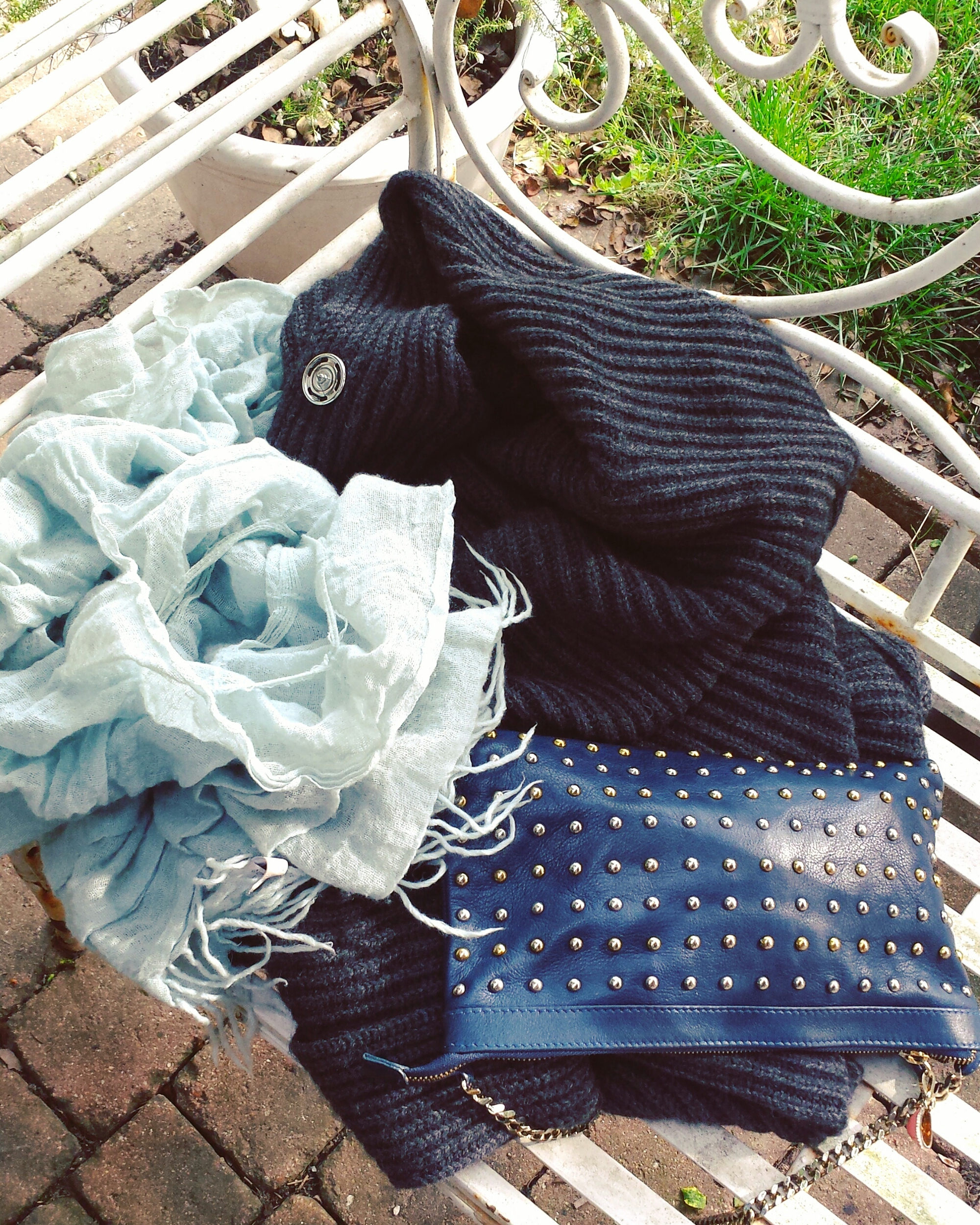 I added a dark blue studded chain purse to go with the blues of the dress, a long drapy baby blue scarf and a gray wool sweater jacket! π The outfit was completed in cozy gray-blue tones, perfect for early Spring. π