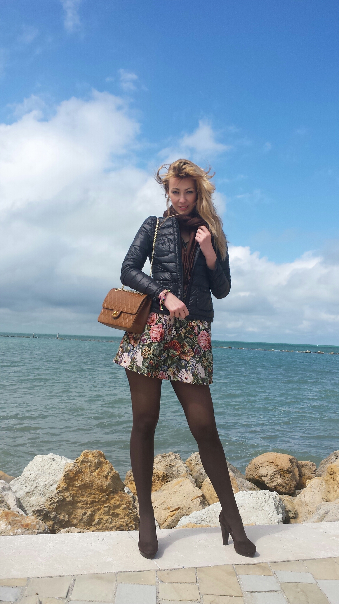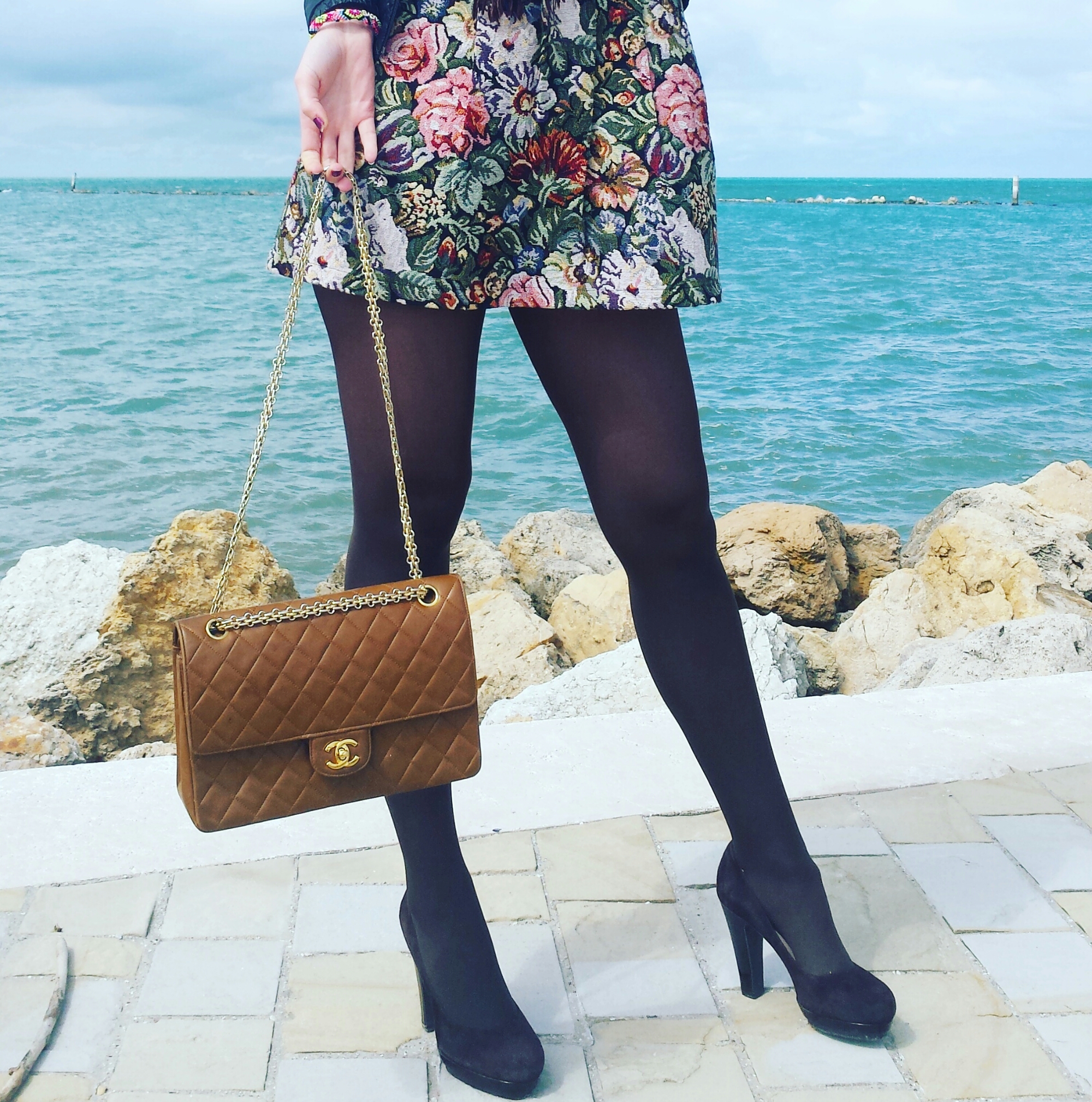 I accessorized my flower tapestry dress signorina in monochrome pieces! In fact, I added a chocolate colored tights and pumps, and a pashmina (yes, I am major scarf lover, it’s a great accessory and very useful on windy days)! As a purse I chose a caramel brown chained Chanel that would pull out the caramel gold tones in my dress, tying in all this look together! 🍮